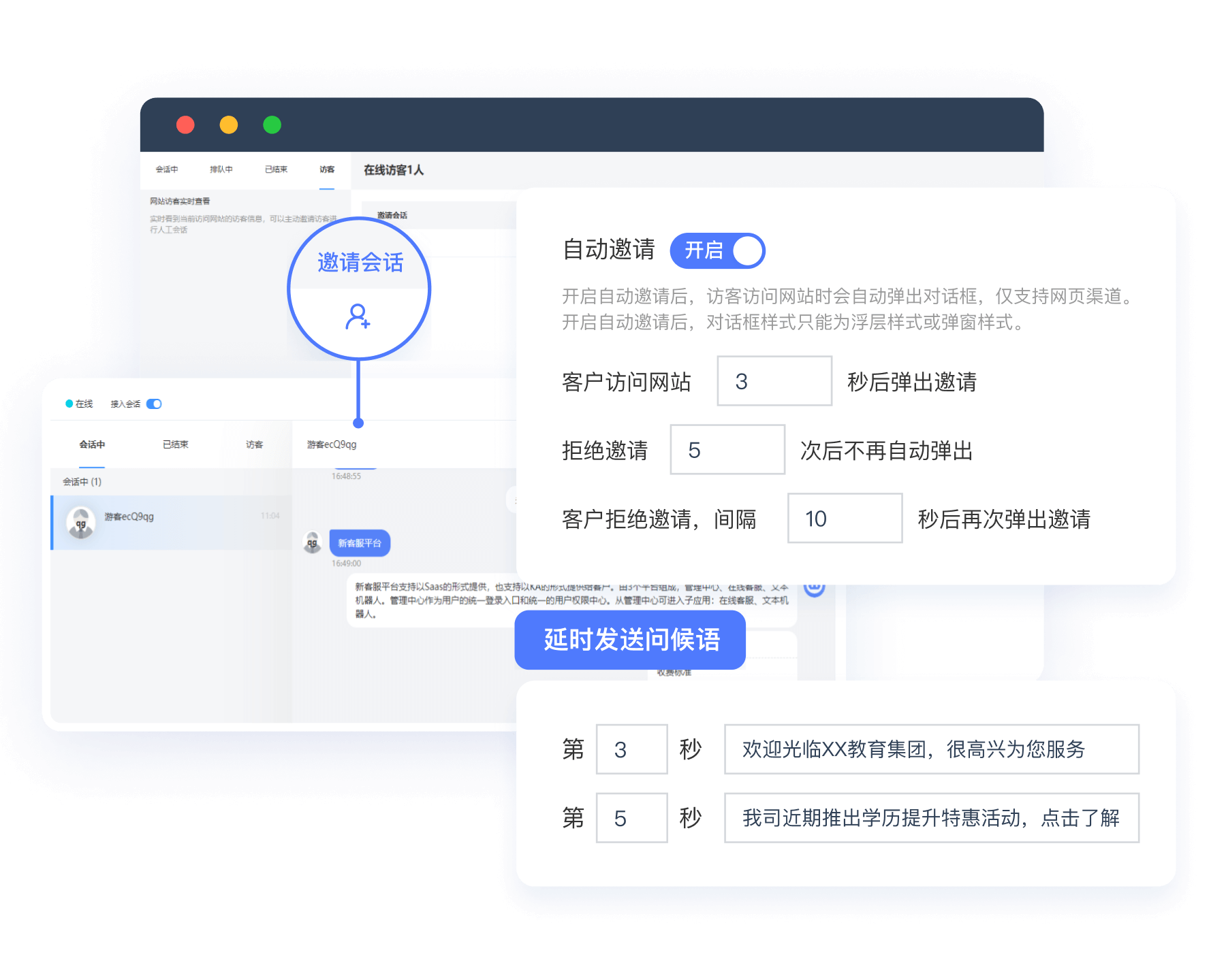 自动弹窗邀请用户进入对话,拟人化延时发送不同话术,提高用户触达与转化