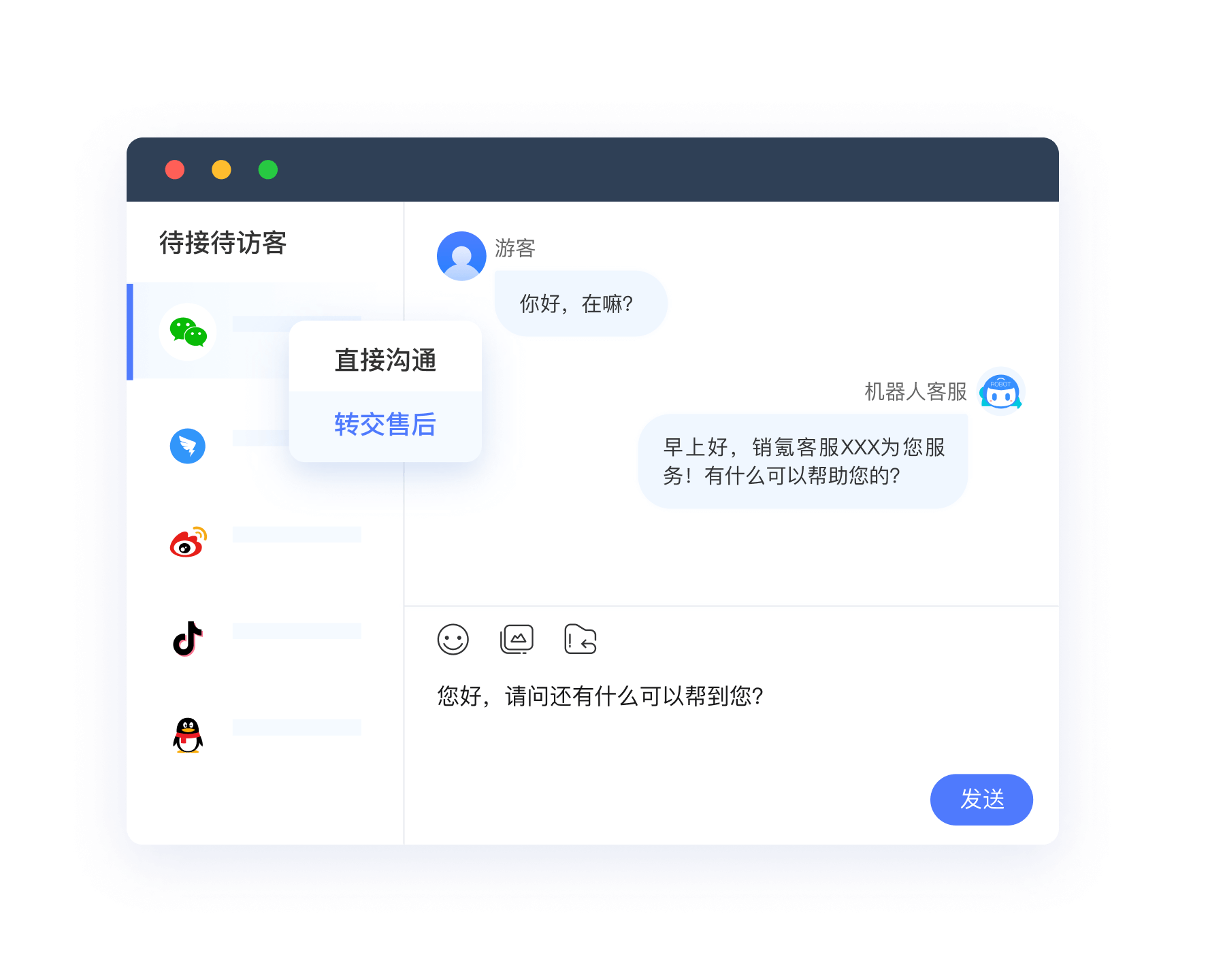 根据业务场景、历史接待记录等智能分配最优客服人员接待;支持定义分配规则,高效分配机器人或人工接待